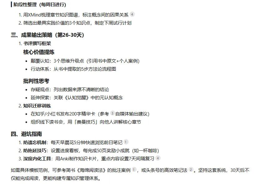 推荐之后,我会继续提问,我想一个月之内高效阅读完这本书籍,并输出详细的读书笔记,请提供详细的方法与策略,这个时候他会写出详细的阅读计划。