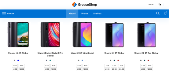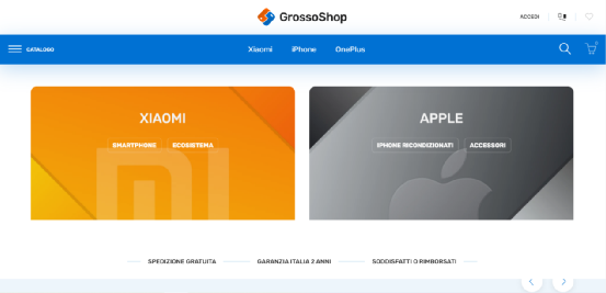 Grosso shop 页面以蓝白色调为主,外加部分品牌色调调色,比如小米的标志橙以及苹果的黑白高级灰。