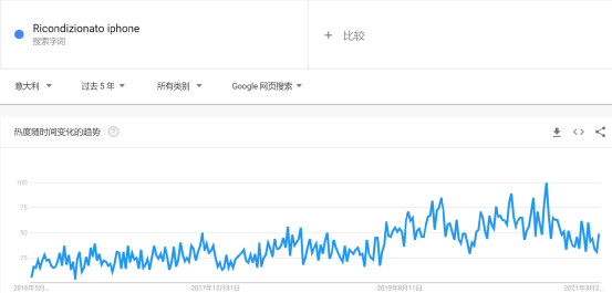 店铺市场定位主推在意大利,Google trends 上 关键词 Ricondizionato iphone (refurbished iphone )5年的搜索趋势。