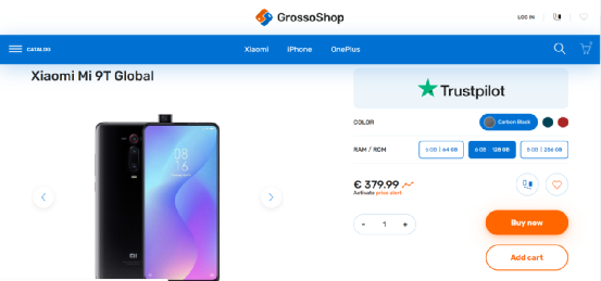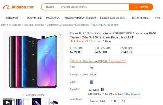 我们选其中一款MI 9T,在阿里巴巴上面一搜,我天啊!5部以上就是259欧,独立站售价是379欧,单台手机赚120欧,月利润达到6w欧真是有可能的事。