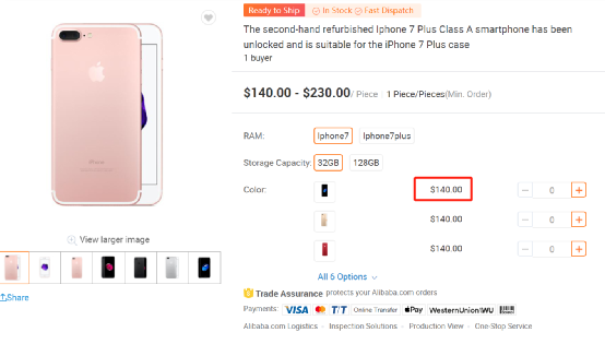 再来看翻新机,阿里上iphone 7 32G单台翻新机140刀,算上邮费37刀,177刀,最低起订量1台。而官网售价349.99刀,算下来一台利润172.99刀,还不用囤货。