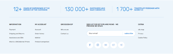 首页底部数字说明方法还是很有效。毕竟购买手机价格比普通用品偏高,网站转化率很大程度取决于网站信任度。在Grosso 店铺里面,你会发现店铺用尽方法强调他们的可靠性。比如: