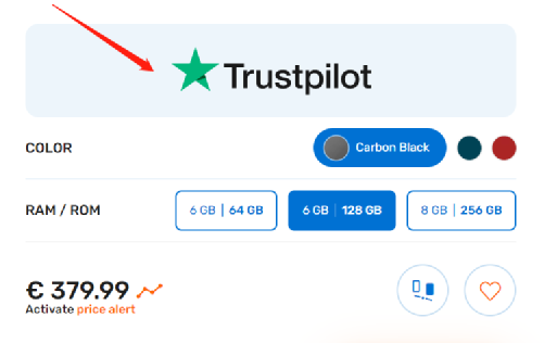 产品页信任度:店主添加了常用的trustpilot。实际上细想,选的是小米、苹果还有一加手机大牌,trustpilot 针对的是手机品牌自身的评价,店主算是代理商,转销售,口碑和品质已经由手机品牌本身塑造好,因此添加trustpilot评价对于店主来说百利无一弊。